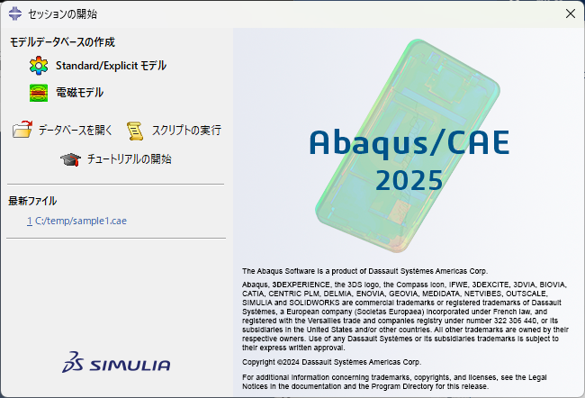 ABAQUS CAEを起動し、セッションの開始ウィンドウの「データベースを開く」から、実行結果ファイル s2a.odb を開きます。