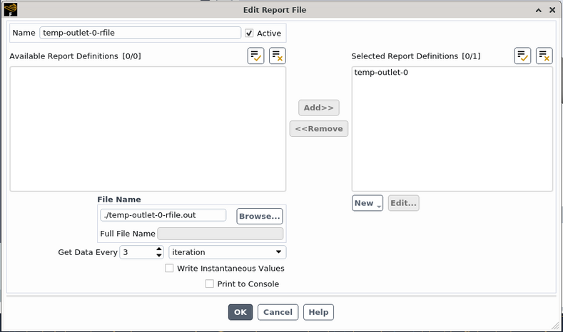 Solution > Monitors > Report Files > temp-outlet-0-rplotをダブルクリックし、Edit Report Plotダイアログを開き、設定を確認します。