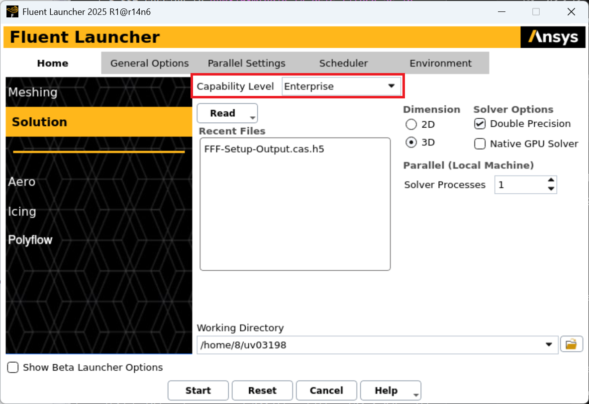 Fluent LauncherのCapability Level(赤枠部分)は Enterprise を推奨します。
