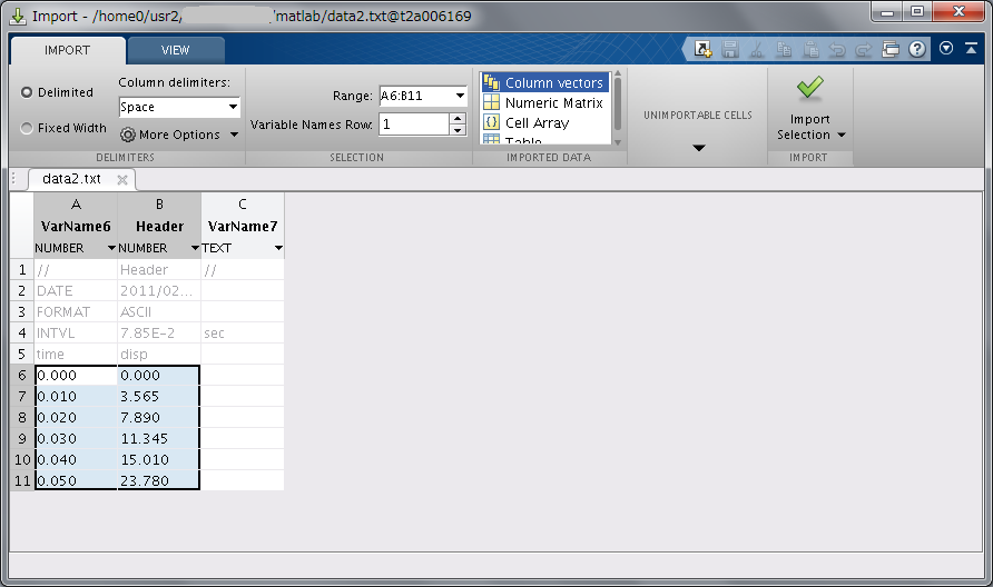 インポートウィザードはMATLABにデータを取り込む際に、その読み込みフォーマットを設定するGUIツールです。