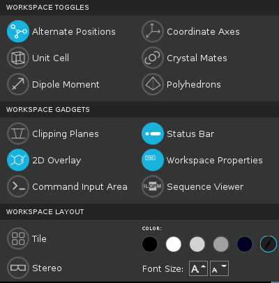 ワークスペースコンフィグレーションツールボックスは、ワークスペースとMaestroの追加機能のレイアウトオプションを統合します。 各項目はアイコンをクリックすることでオンオフすることができ、オンにするといくつかのオプションが追加されます。