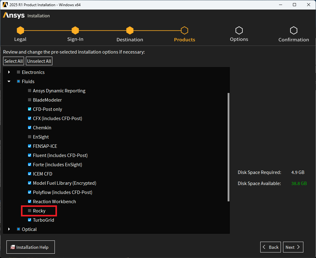 Ansys Rocky is not selected for installation by default. Please check the box for “Rocky” when selecting the products to install.